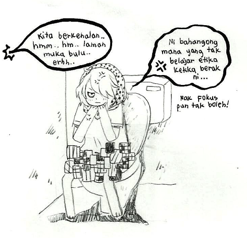 korang tau tak yang tak semua orang boleh fokus membuang dalam keadaan bising dan salah seorang manusia tu adalah aku. aku tak boleh bayang orang yang membuang siap nyanyi2. dan korang tau tak yang bercakap ketika membuang membuatkan kita bebal? serius. aku lagi prefer pergi tandas makmal yang jauh gila sebab lebih tenang. dan 100x lagi bersih+wangey! (err aku je ke yang amalkan masuk tandas tutup kepala? korang buat tak?? *lukisan hanya imaginasi, jangan pikir bukan2)